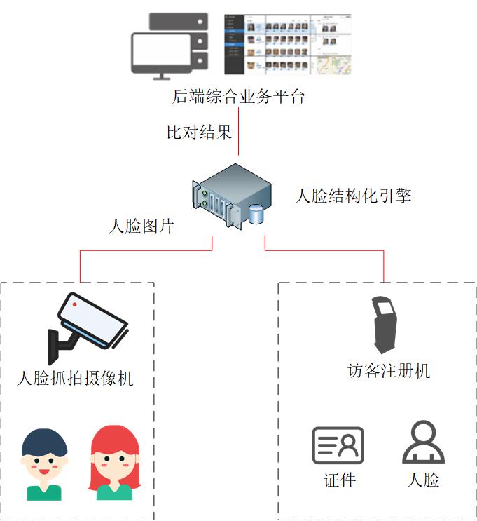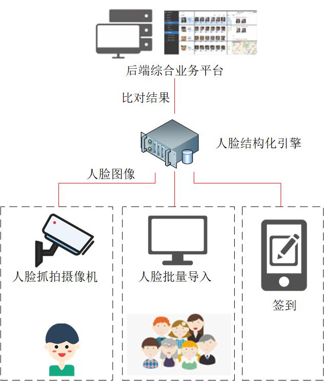 在智慧商業園區布(bù)設的人臉識別係統,由人臉識別門禁子係(xì)統、人臉識別(bié)訪客子係統、會議簽(qiān)到子係統、人臉識別布控(kòng)子係統、人臉比對一體化引擎、中心(xīn)管理平台等組成,可達到以(yǐ)下應用效果。