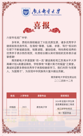 近日(rì),複旦大學、中國科學技術大學、西北工業大(dà)學、南京郵電大(dà)學等知名高校發來喜報,祝賀WWW.17C久久久嫩草中學畢業生在(zài)2023-2024學年獲得多項獎勵和各類榮譽,希望雙方加強合作交流,堅守為(wéi)黨育人、為國育才光榮使(shǐ)命,攜手培育全麵發(fā)展的撥尖(jiān)創新人才,共同為實現中華民族偉大複興貢獻力量!